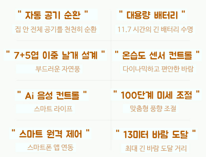 BLDC 모터를 사용해 소음이 적으며, 그리고 다른 제품에서 볼 수 없는 1단부터 100단까지 바람 세기 조절, 그리고 좌우 상하 각도로 회전이 가능한데, 각도 범위도 정할 수 있어 사용자 친화적인 세팅을 할 수 있다는 것입니다.