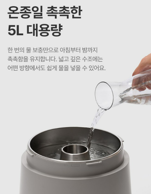 성능 면에서도 뛰어난데, 시간당 최대 600ml의 높은 가습 능력과 5L 용량의 대형 물통을 갖추고 있어 자주 물을 보충할 필요가 없습니다.