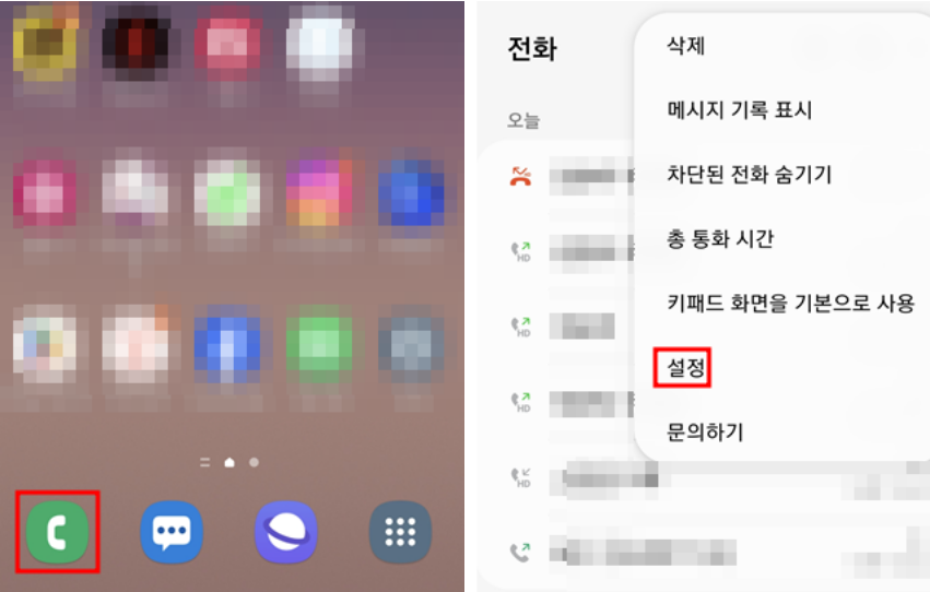 먼저 핸드폰에서 전화기 모양 있는 걸 손가락으로 터치해 주시고 오른쪽 윗쪽 부분에 보시면 점 세 개가 있어요. 여기 터치하고 아래쪽에 설정 눌러 주세요.