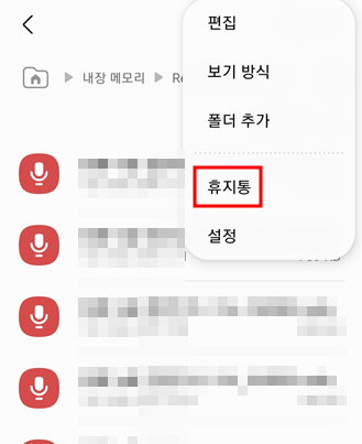 오른쪽 위쪽에 점 세 개 부분 손가락으로 터치해 보세요. 그럼 여기에 가시면 휴지통이 이라고 있어요.