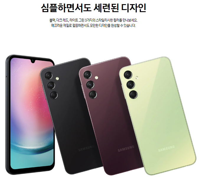 갤럭시 A24는 S23시리즈와 마찬가지로 물방울 디자인을 적용했습니다. 그래서 멀리서 언뜻 보면 S23시리즈처럼 보이기도 합니다.