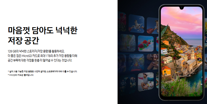 갤럭시 A24의 메모리는 4GB 램, 128GB 저장장치를 탑재했고, 외장 슬롯을 이용해서 1테라까지 마이크로SD 카드를 사용할 수 있습니다.