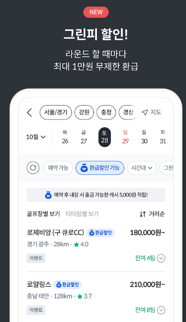 - 티타임 청약 서비스: 원하는 시간대의 티타임이 없을 때 유용한 기능입니다. 찾고 있던 티타임이 오픈되면 예약할 수 있는 기회를 제공하며, 앱 사용 빈도가 높을수록 당첨 확률이 올라갑니다.