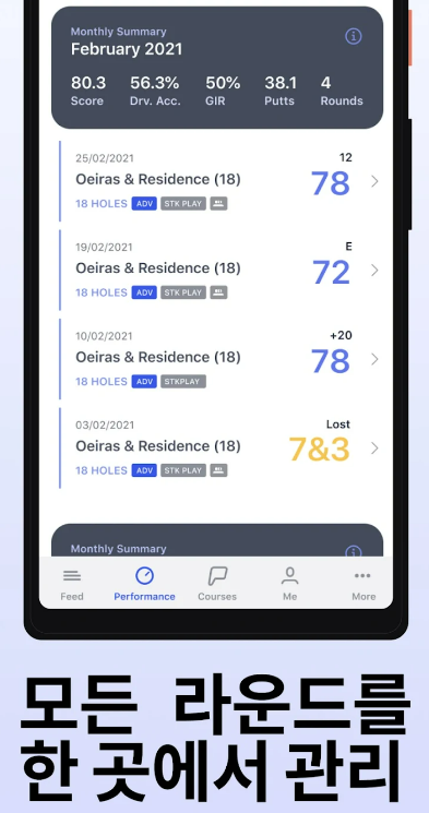 - AI 스코어 관리: 라운드 종료 후 스코어 카드를 촬영하면 AI가 자동으로 정보를 인식하고 기록합니다. 수동으로 입력할 필요 없이 간편하게 스코어를 관리할 수 있습니다.