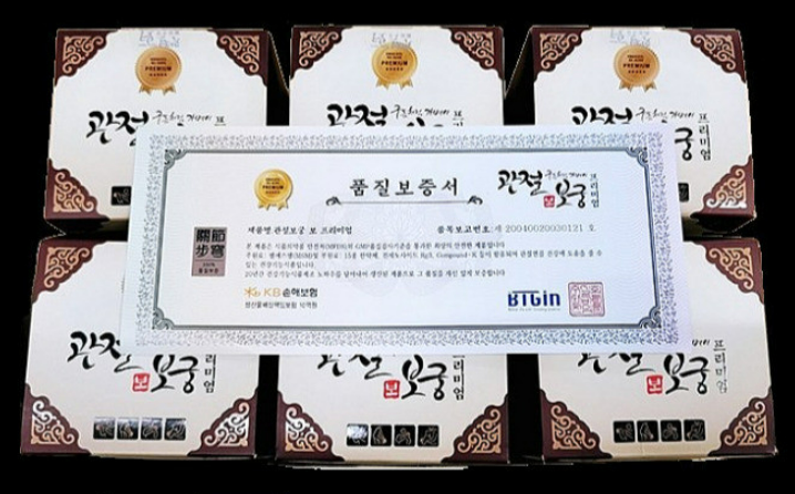 관절보궁 보와 궁 제품자체의 디자인도 너무 고급스럽고 안에 품질보증서까지 들어있습니다. 또 우수건강기능식품 제조 및 품질관리 기준에 적합해야 인증받을 수 있는 GMP마크까지 붙어있습니다.
