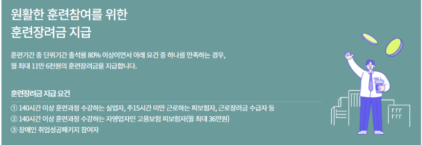 국민내일배움카드로 140시간 이상의 훈련과정을 수강하는 교육생에게는 교통비와 식비 명목으로 훈련장려금도 추가로 지급하는데요.