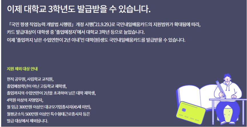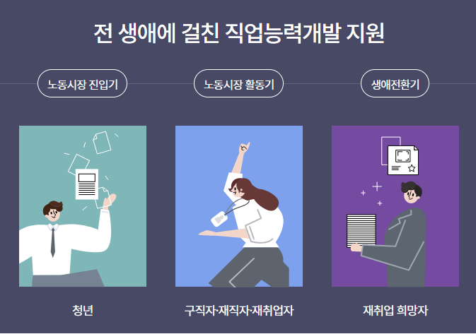 국민내일배움카드는 구직자, 재직자, 실업자, 특수형태근로자, 자영업자 등 대한민국 국민이라면 누구나 신청할 수 있는데요.