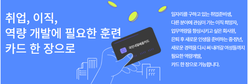국민내일배움카드는 청년부터 구직자, 재직자, 재취업자까지 국민 스스로가 자기 개발을 할 수 있도록 국가에서 훈련비 등을 지원해 주는 제도입니다.