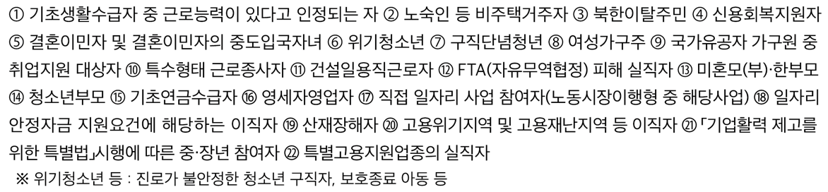 위의 대상에는 해당이 되지만 아래와 같이 Ⅰ유형에 참여할 수 없는 대상도 있습니다. - 근로능력, 취업 및 구직의사가 없는 사람 - 군 복무 등으로 즉시 취업이 어려운 사람(단, 2개월 이내 전역예정인자 제외) - 국민기초생활보장법 생계급여 수급자(단, II유형에는 참여할 수 있음) - 실업급여를 받고 있거나 수급 종료 후 6개월이 지나지 않은 사람 - 국가 또는 지방자치단체가 구직활동에 필요한 비용을 지원하는 수당이 월 평균 지원금액 50만원 이상이거나 총 지원액 총 지원액 300만원 이상인 사업에 참여중이거나 수급 종료 후 6개월이 지나지 않은 사람 - 정부 지원 직접일자리에 참여하고 있거나 참여 종료 후 6개월이 지나지 않은 사람. - 신청인의 월평균 총소득이 1인 가구 기준 중위소득의 60%를 넘는 사람 - 정부 지원 직접일자리에 참여하고 있거나 참여 종료 후 6개월이 지나지 않은 사람.