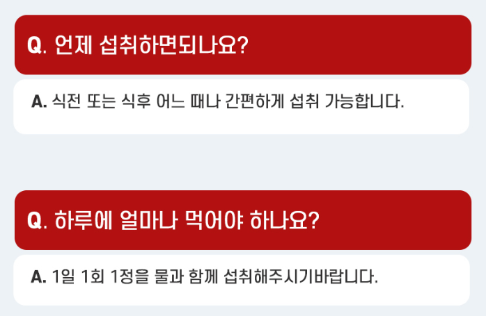 처음 섭취하시는 분들은 며칠간 반 정씩 나누어 복용하면서 자신의 체질에 맞는지 확인해보시는 것이 좋습니다. 또한 충분한 물과 함께 섭취하시면 흡수율을 높일 수 있습니다.