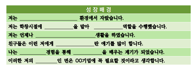→ 자기소개서 성장배경을 작성 시에는 위의 직종별 성장배경 작성 예시를 참고하여 본인의 희망 직무와 성장 경험 연결고리를 찾아 작성하시길 바랍니다. 그리고 위의 예시를 읽어보시면 알겠지만 성장배경이라고 꼭 유소년 시절처럼 어린시절의 이야기만으로 풀어내는 것은 아니고 어느 때나 특정 시기에 경험한 사항을 풀어내면 된다는 점을 기억하시면 좋겠습니다.