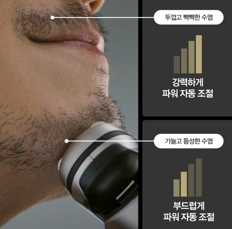 - 다이렉트 커트리머: 특수 설계된 트리머가 여러 방향으로 자란 수염을 효과적으로 처리합니다. 특히 턱 아래와 목 부위의 까다로운 수염도 완벽하게 제거합니다.