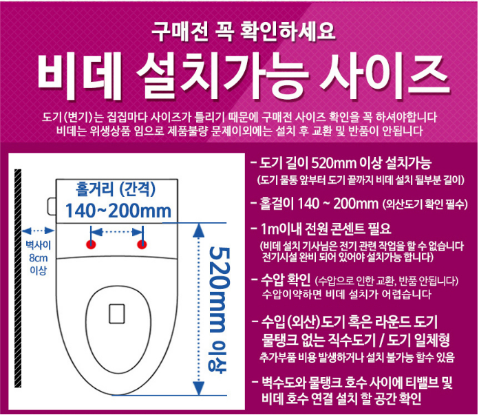 각 비데 모델마다 사이즈가 다르므로 구매 전에 반드시 사이즈를 확인하세요. 이 과정에서 변기와 비데의 사이즈 불일치로 인한 불편함을 사전에 예방할 수 있습니다.