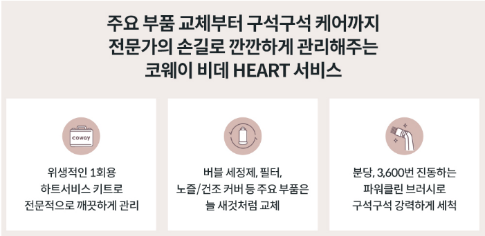 렌탈 기간 중에는 무상으로 AS 및 케어 서비스를 받을 수 있으므로 위생적으로도 유리합니다. 또한, 고장나면 즉시 교체해주므로 안정적인 사용이 가능합니다.