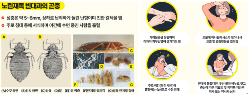 빈대는 노린재목 빈대과 곤충으로 성충은 약 5~6mm 정도 되고 납작하게 눌린 난형으로 진한 갈색을 띄는데요. 주로 침대 등에 서식하며 야간의 활동을 하면서 사람의 피를 흡혈합니다.