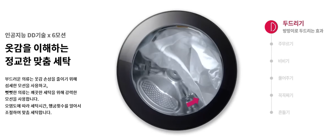 이 방식은 세제의 효과를 극대화하여 세탁력을 향상시키고, 옷감 손상을 줄이는 데 도움을 줍니다. 반면 LG는 'DD 모터와 6모션 세탁 방식'을 사용합니다.