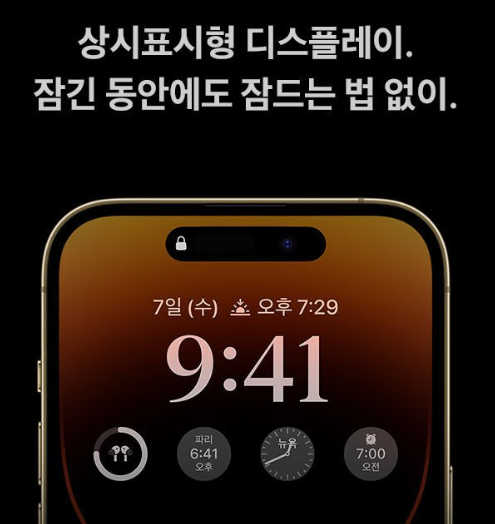 그러나 전작 대비로 큰 차이가 존재하는데 꾸준히 탑재된 노치 대신 들어간 다이나믹 아일랜드가 특징입니다.