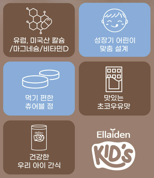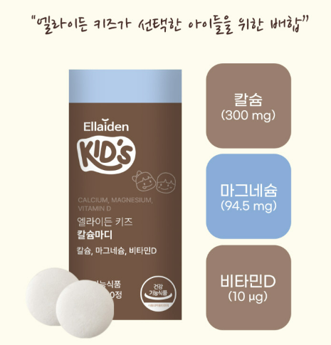 엘라이든 키즈 칼슘마디는 성장기 어린이의 필수 영양소인 칼슘, 마그네슘, 비타민 D를 포함하고 있습니다. 이러한 영양소들은 뼈의 형성과 강화를 돕고, 전반적인 신체 발달에 기여합니다.