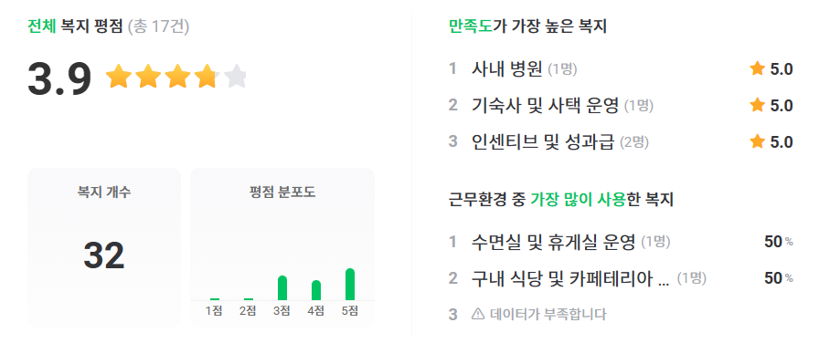 ★ 복지 관련 현직자 한마디 ▲ 의료비 지원. 부인 자녀 가족 최대 일억 원까지 지원하는 제도는 좋은 거 같음 치과 치료비도 삼 년에 이백 ▲ 회사 제휴 콘도/호텔 이용. 구내식당 샐러드 제공. 비 오면 프런트에서 우산 빌려주는 것. ▲ 2주 연속으로 휴가를 갈 수 있게 하는 집중휴가 제도, 야근한 만큼 쉬고 싶은 날에 오프타임 ▲ 주택 자금 대출이 1억 원까지 되는 것이 장점 ▲ 학자금 제도가 잘되어있고 회사 어린이집이 있음 ▲ 복지포인트나 몇 년에 한 번씩 지원되는 가전제품 구매 지원 등