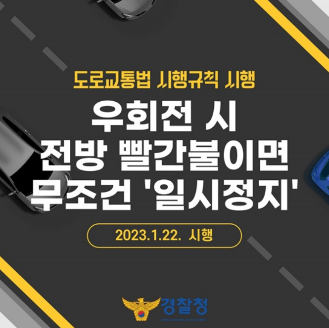 지난 22일부터 새로 개정된 도로교통법 시행규칙에 따라 우회전 시 전방 빨간불이면 무조건 ‘일시정지’ 해야 합니다.