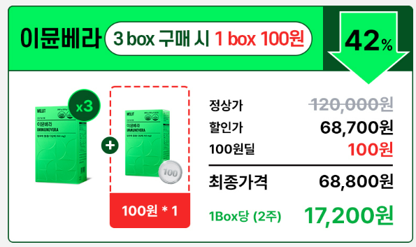 웰릿 이뮨베라의 가격은 패키지에 따라 다양하며, 1박스당 20g X 14포(280g)로 구성되어있으며 1박스에 22,900원 대에 판매되고 있습니다. 여러개 구매 시 추가할인이 있으니 자세한 사항은 공식판매처에서 확인할 수 있습니다.