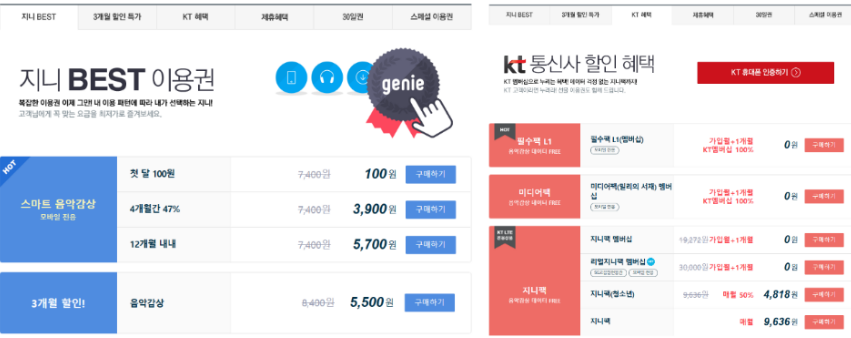 지니뮤직은 타 스트리밍 앱에 비해 매우 다양한 이용권 종류를 제공합니다. 할인 이벤트도 다양하게 제공하고 있습니다.