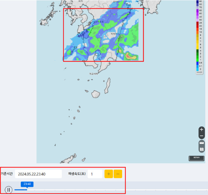 예를 들어, 17:00에 지도를 돌려봤을 때, 17:30에 내가 가려는 지역에 비구름이 없다고 예상했는데 실제로 17:30이 되어 비가 내리기 시작하면 지도를 다시 확인해 보면 비구름이 내 위치를 포함하여 덮고 있습니다.
