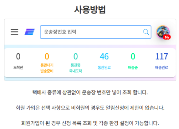 이 기능을 통해 배송완료 및 통관완료 알림 기능을 통해 물품을 받았지만 아직 배송완료로 처리되지 않은 경우, 통관완료 예상일 등의 알림을 제공합니다.