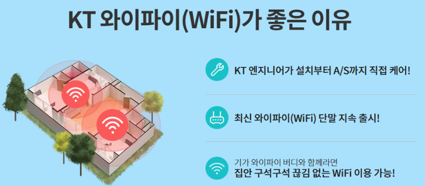 그리고 와이파이 증폭기를 별도로 구매해서 사용하시는 분들도 있겠지만 사용하다 보면 고장이 나서 AS를 받아야 할 일도 생기는데요. 통신사의 증폭기를 사용하시게 되면 AS부분에서는 걱정하실 일은 없겠습니다.