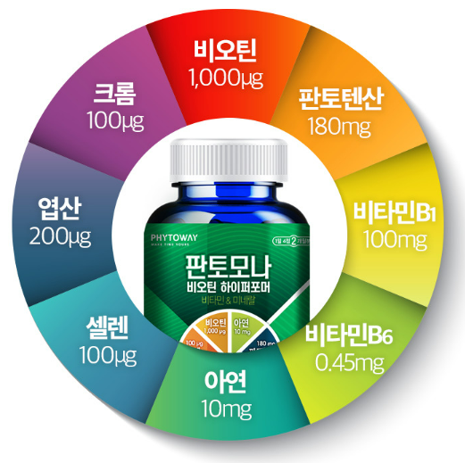 우선 비오틴으로 1,000ug정도 충분한 함량이 들어가 있고 비오틴은 판토텐산이랑 흡수 경쟁을 하는데 이 비오틴을 너무 많이 먹게되면 판토텐산이 부족해질 수가 있습니다.