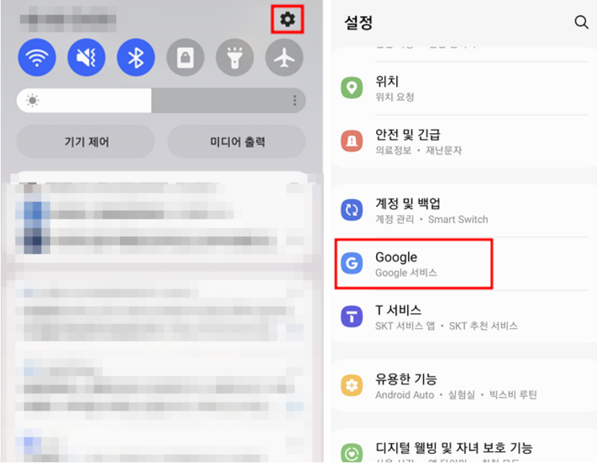 우리 핸드폰 화면에서 맨 위쪽에 손가락을 두고 이렇게 쭉 한번 내려 보세요. 그러면 오른쪽 위에 톱니바퀴 모양의 설정이 나오고요. 손가락으로 터치 아래쪽에 쭉 내리시면 구글이라고 있어요.