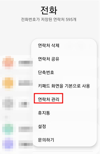 핸드폰에서 연락처 앱을 찾아 주세요. 연락처 앱을 찾아서 점 3개를 모양을 손가락으로 터치해 주시고 연락처 관리라고 있습니다.
