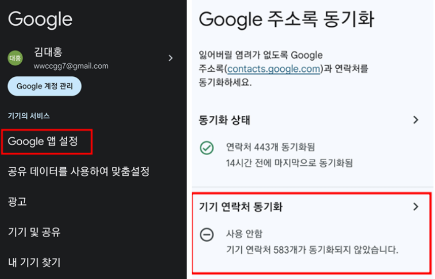 구글에 들어가면 내 계정이 나오고 아래쪽에 구글 앱 설정>구글 주소록 동기화에 들어가 줍니다. 그러면 동기화 상태가 나오고 기기 연락처 동기화가 있는데 보통 사용안함으로 설정되어 있을 겁니다.