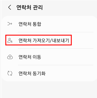 들어가시면 여기에 연락처 가져오기/내보내기가 있는데 내보내기는 여기 핸드폰에 있는 연락처를 바깥으로 내보내 저장한다는 뜻이고 가져오기는 다른 곳에 저장되어 있는 연락처를 가져오는 역할이에요.