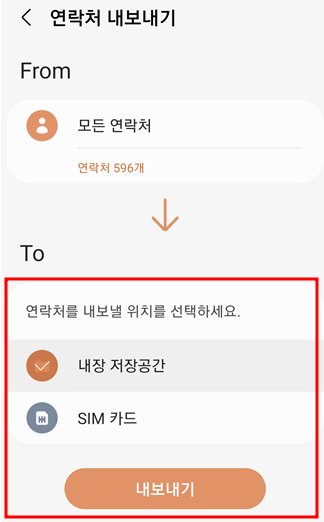 그래서 내보낼 때는 들어가서 내장 저장공간이라고 하는 핸드폰 자체 저장공간에 내보내기 눌러 주시면 자동으로 내 핸드폰에 모여 있는 연락처가 저장공간으로 보내집니다.