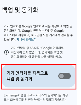 그래서 기기 연락처 동기화의 회색으로 되어 있는 부분을 바꿔주시면 됩니다. 여기서 중요한 것은 구글 계정 하나에만 동기화를 시키실 수가 있어요. 설정 변경 후 5분 정도만 기다리면 바로 동기화가 시작이 됩니다.