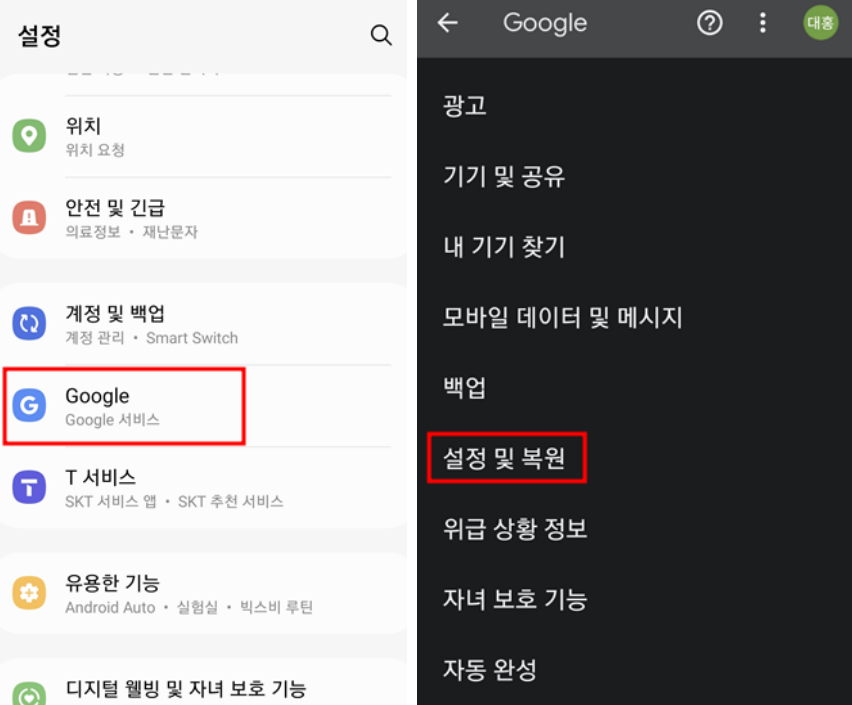 똑같이 아까처럼 설정에 들어가셔서 아래쪽에 쭉 내려보시면 구글이 있고 들어가서 설정 및 복원이라고 있습니다. 손가락으로 터치하면 연락처 복원이라고 있어요.
