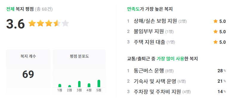 ▲ 교통/출퇴근 통근버스 운행, 기숙사 및 사택 운영, 주차장 및 주차비 지원, 유류비 지원, 자율 및 탄력 근무 제도, 주 4일 / 주 4.5일 근무, 야간 교통비 지원, 재택근무제도, 절반 근무 및 문화 데이