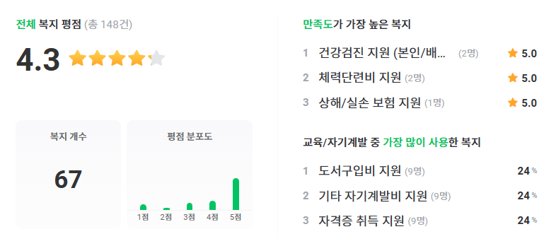 ★ 복지 관련 현직자 한마디 ▲재택근무, 통근버스, 조식이용, 출장비 지원, 이러닝 교육, 복지포인트, 차량 구매 할인 등이 좋음 ▲명절에 주는 상여금과 재래시장상품권, 3월 9월 자기계발포인트, 성과급, 의료비 지원해 줌 ▲자동차 할인이 크며 여러 정기적인 교육이 있으며 동아리가 있음 ▲자율출퇴근으로 시간을 모아서 일찍 퇴근하고 싶은 날에는 일찍 퇴근함. ▲여름휴가는 정말 좋은 제도이다 5일 연속으로 쉴 수 있어서 리프레쉬가 된다. ▲차량 지원, 복지 포인트, 차량 부품 지원, 자녀 학자금 지원 등이 대표적입니다. ▲수목금 3시 퇴근 가능, 매일 10시 출근 가능, 자동차 할인이 현대/기아 모두 돼서 좋다.