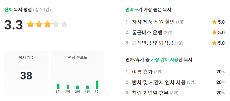 ★ 복지 관련 현직자 한마디 ▲ 상여금은 두둑히 챙겨줍니다. 명절 근로자의 날 창립기념일 등등 ▲ 매주 금요일 조기퇴근이 가능합니다. 시프티 사용으로 유연출근제가 일부 가능함 ▲ 주유권을 활용한 유류비 지원으로 교통비를 절감할 수 있습니다 ▲ 의료비 지원제도(연 400만 원 한도 / 본인부담금 10만 원) ▲ 선배님들 얘기를 들어보면 아무래도 주택대출이랑 자녀 학자금 지원이 큰 거 같다 ▲ 주유상품권, 회사 숙박권, 의료비지원, 주택융자금대출, 회사 밖 식당이용