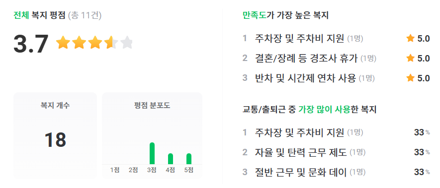 주차장 및 주차비 지원, 자율 및 탄력 근무 제도, 절반 근무 및 문화 데이