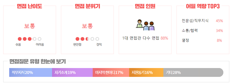 ▲ 꼬리질문이 생각보다 딥하게 들어와서 당황한 느낌을 받은 면접이었습니다. pt관련 질문도 들어오고, 자신의 경험을 잘 설명할 줄 알아야 합니다. ▲ 본인의 생각이 정답은 아니나 논리적으로 풀어가며 이해시키면 됩니다. ▲ 직무와 관련해서 집중적 질문이 들어옵니다. ▲ 경험과 경력을 토대로 답변하였고 면접 분위기는 아주 편안한 분위기로 진행되었으며 인성을 많이 보는 듯했습니다. ▲ 1차 면접에서 포트폴리오에서 제가 질문을 유도할 수 있는 내용으로 짰고, 2차 면접은 인성 위주의 질문이라 준비해도 대응하기 어려웠습니다.
