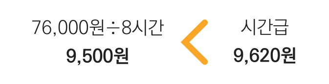 ○ 일급 예시) 1일 8시간 근로하고 일급 76,000원을 받는 경우 ⇒ 9,500원(76,000원÷8시간)은 2023년 최저임금 시간급 9,620원보다 적기 때문에 최저임금법 위반
