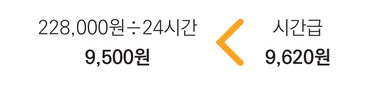 ○ 주급 예시) 1일 4시간, 1주(5일) 간 총 20시간 근로(개근)하고 주급 228,000원을 받는 경우 ⇒ 9,500원(228,000원÷24시간)은 2023년 최저임금 시간급 9,620보다 적기 때문에최저임금법 위반 * 24시간(1주 20시간+유급주휴 4시간)