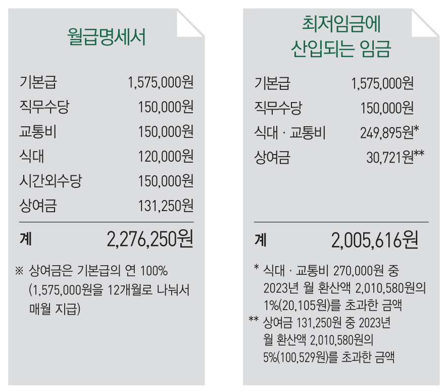 ○ 월급 예시) 소정근로시간이 1주 40시간인 근로자가 2023년 1월 급여 2,276,250원을 받는경우 ⇒ 추려낸 임금을 시간당 임금으로 환산 9,596원(2,005,616원÷209시간)은 2023년 최저임금 시간급 9,620원보다 적기 때문에최저임금법 위반