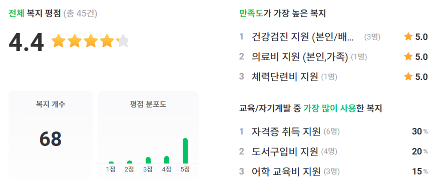 ★ 복지 관련 현직자 한마디 ▲ 매년 충전되는 행복 카드(복지 카드)가 진짜 좋고, 최초 자가 주택 구입 시 최대 2억 원까지 저리로 대출 가능. ▲ 연간 주어지는 300만 원 복지카드, 치과비용 50% 지원 ▲ 금요일은 조금 더 자유롭게 일찍 퇴근 가능. 탄력 근무제. ▲ 유연근무제 주 단위로 40시간 채우면 됨 의료비 연간 1억 원 사용 ▲ 자기계발을 할 수 있도록 지원을 해줍니다. 어학 관련 강의를 따로 들었습니다 ▲ 연차 사용 시 자가 승인이고 상사 결제가 필요 없음 ▲ 월세 60만 원 지원(3년간) 해주는 제도가 매우 마음에 들었다.
