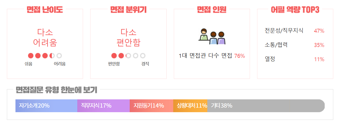 ▲ 영어면접은 대화형식이었고 나는 영어를 잘 못했기 때문에 기억이 안 났지만 보통 오픽 보는 것과 비슷하다고 했습니다. 패기면접에서는 자소서를 파고들었습니다 그래서 자소서를 다시 읽으면서 예상질문을 정리하는 것이 좋을 것 같습니다. ▲ 회사에 대한 전반적인 이해가 필요하고 관련 전공 지식 많이 공부하는 게 좋습니다. ▲ 정해진 답을 외워가는 것보다 자연스럽게 하는 게 좋은 것 같습니다. ▲ 자기소개서에서 쓴 경험을 확실하게 분석하고 준비하시는 게 좋습니다. 혹여나 자기를 부풀리기 위해 거짓말을 하시는건 바로 들통나니깐 솔직하게 하시는게 좋습니다. ▲ 본인의 경험뿐만 아니라 산업 전반에 대한 높은 이해도를 가지고 있어야 통과할 수 있는 면접이라는 생각이 들었습니다.